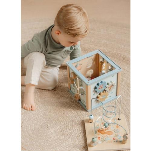 Chaque face contient des éléments enchanteurs du thème des amis de la forêt et propose des activités éducatives amusantes, telles qu'une baguette à formes, des engrenages, des puzzles et, au sommet, une spirale de perles.