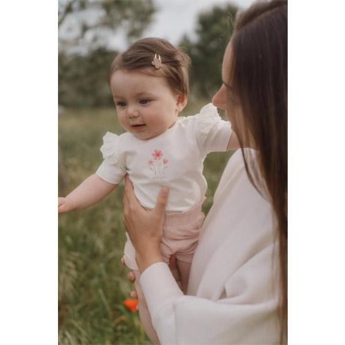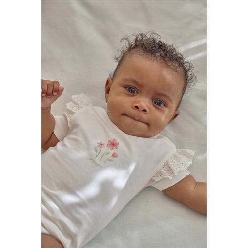 Les jolis volants aux épaules et le coton biologique fin garantissent confort et liberté de mouvement.