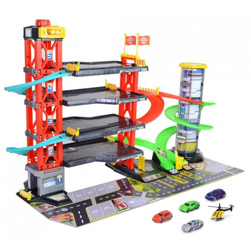 Grote garage met 5 verdiepingen met lift, racebaan, speelgoedauto's, helikopter, geluid en licht.