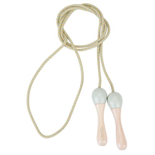 De zachte kleuren oker en groen komen zowel in het touw als in de houten handvatten terug.