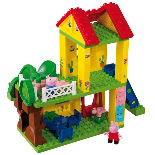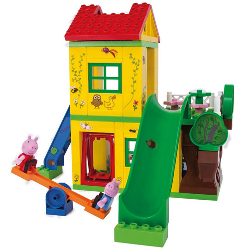 The set includes a house with 3 floors, a slide, swing, seesaw, table and chairs and the play figures Peppa and George.