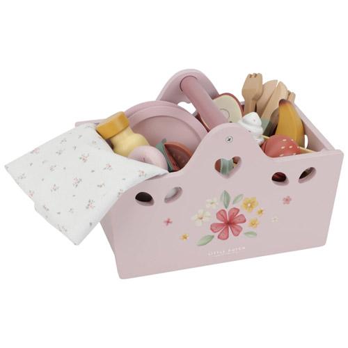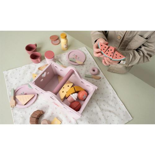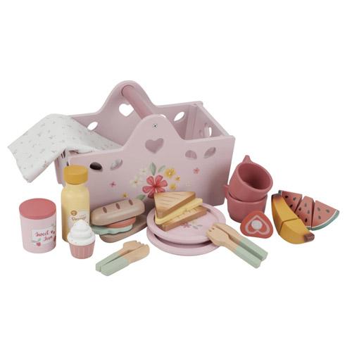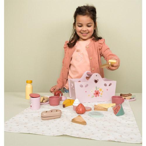 The wooden picnic basket is packed with delicious food, including 2 sets of cups, plates and cutlery, and of course a blanket, making it the perfect setting for role play.