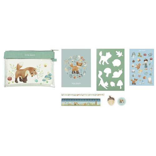 The pencil case contains a cute notebook decorated with sweet forest animals, a colorful sticker sheet to brighten up each creation and a sturdy ruler to make straight lines.