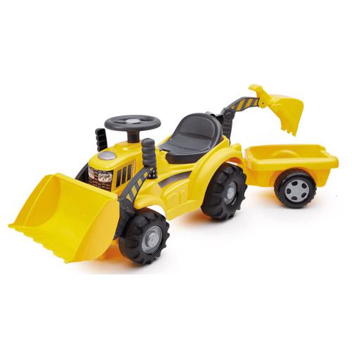 The tractor features a shovel at the front, a mechanical digger and a detachable trailer at the back.
