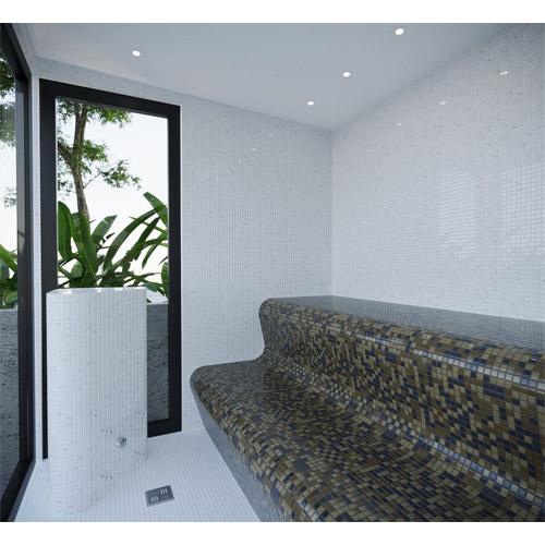 Finition intérieure: murs, banquette, meuble indépendant et socle en mousse EPS rigide revêtue de mosaïque Ezarri.