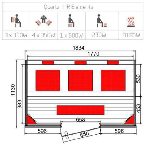 - Radiateurs en quartz avec grilles biseautées rouges, sol et banc chauffant.