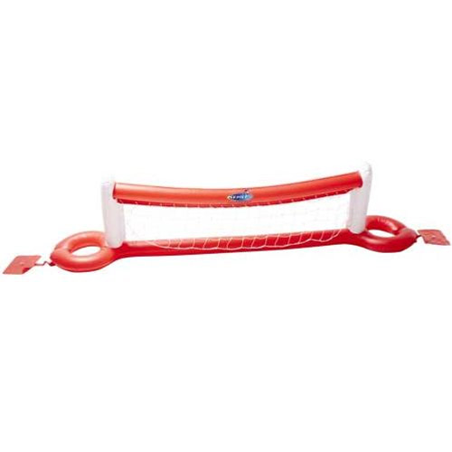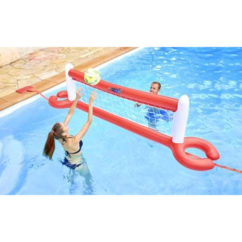 Le jeu de volley ball est constitué d'un filet entouré de coussins gonflables est équipé de poches d'eau pour lester la structure.
