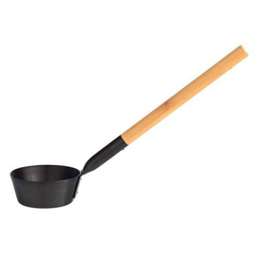 Stijlvolle saunalepel vervaardigd van geanodiseerde aluminium en warmte-behandeld bamboehout.