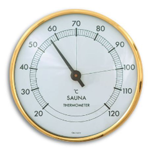 Thermometer uit kuntstof met goudkleurige metaalring in ronde vorm voor gebruik in sauna of infraroodcabine.