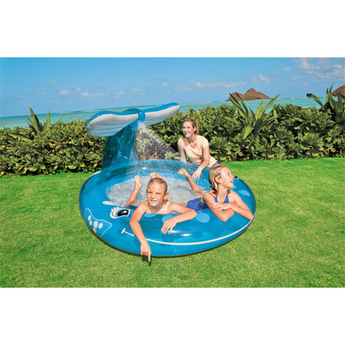 Une piscine pour enfants en forme de baleine prévu d'une fontaine intégrée.