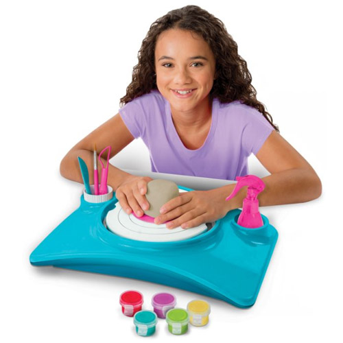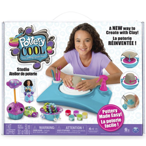 Contenu: un tour de potier, 4 moules; 4 galettes d'argile, du peinture métallisées et un pinceau, 2 outils pour graver des motifs et 1 pot à outils.