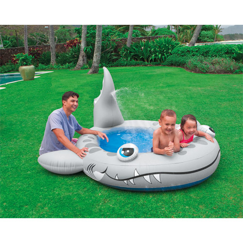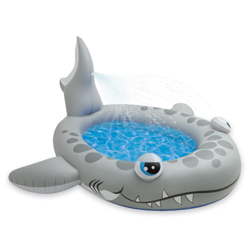 Piscine enfants en une couleur gris avec un requin illustré, la queue du requin arrose les enfants qui sont dans la piscine.