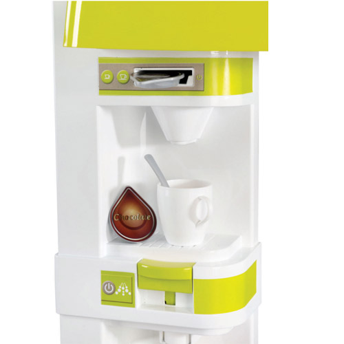 Une machine à boissons gazeuses avec son et une machine à expresso avec des languettes autour de l'équipement.
