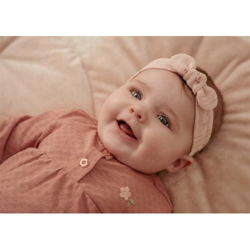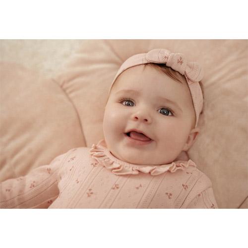 Vous avez le choix entre un bandeau en pointelle rose pâle avec des fleurs délicates et un bandeau uni en tissu fin et structuré.