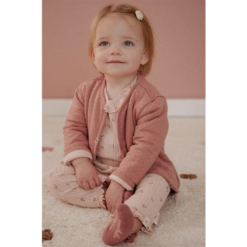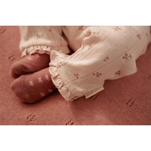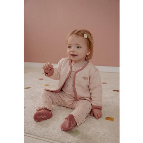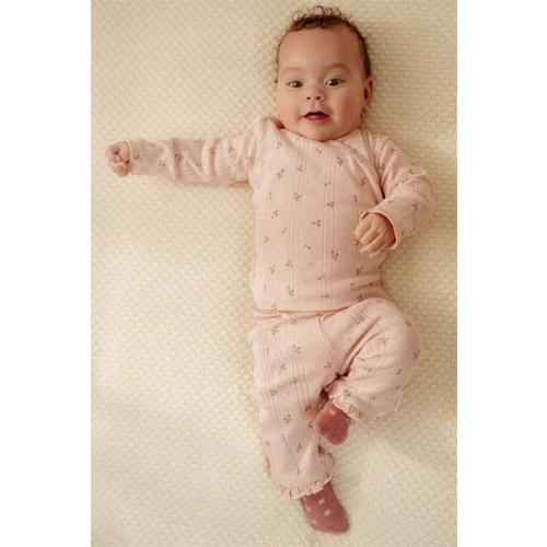 La structure complexe en pointelle du tissu, dans une jolie nuance de rose clair, est ornée d'un charmant imprimé de petites fleurs.