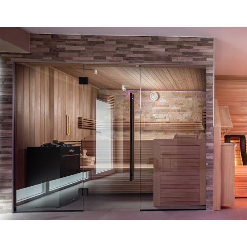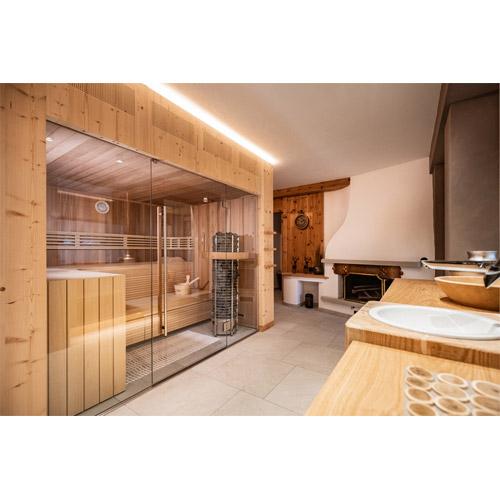 De saunacabine bevordert de bloedsomloop en de ademhaling, vervaardigd uit duurzaam hout.