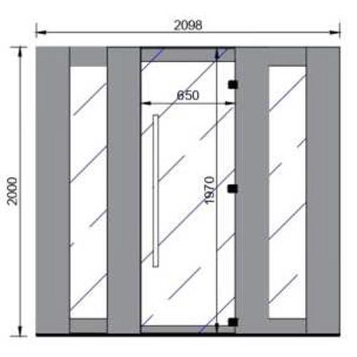 -Deur in helder gehard glas 1970 mm x 650 mm x 8 mm dik en twee veiligheidsglasramen 8 mm dik.