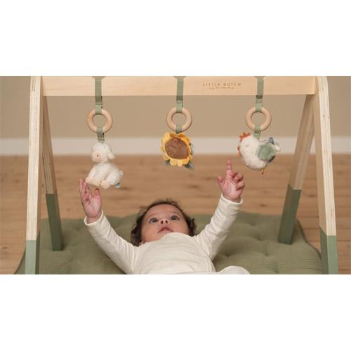 Nieuwsgierige baby's vermaken zich kostelijk met deze houten babygym.
