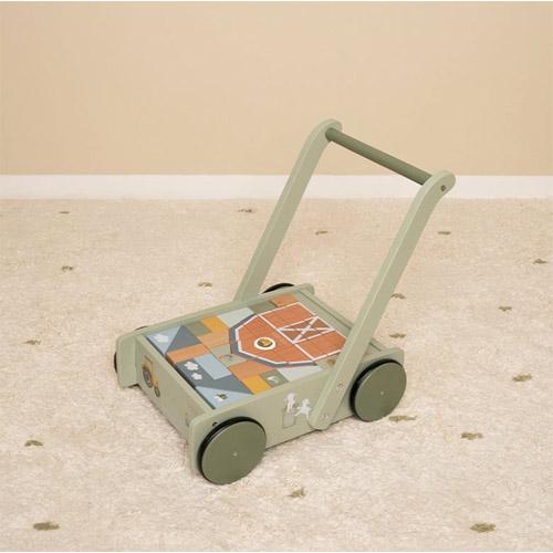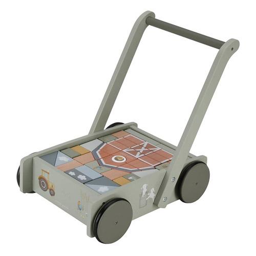 De blokkenkar is voorzien van houten wieltjes en gevuld met gekleurde houten blokken met daarop prachtige tekeningen uit de Little Farm collectie.
