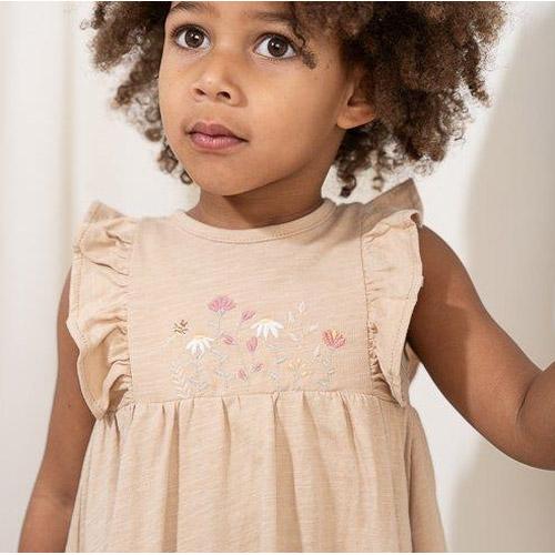 Op de voorkant van het jurkje zit een mooi borduursel van bloemen en de armsgaten van het jurkje zijn afgewerkt met schattige ruches.