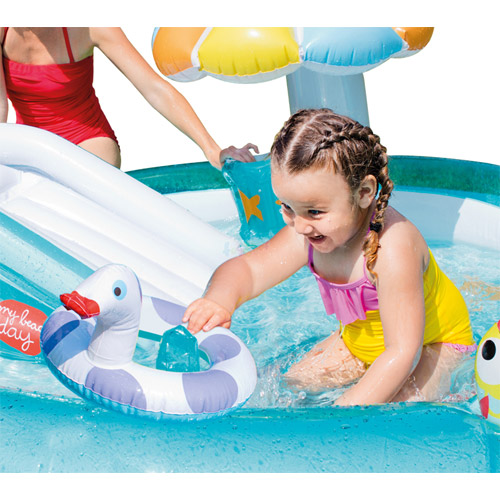 Inbegrepen: glijbaan, paddenstoel, krokodil, twee vissen, één baby eend en één vis mandje.