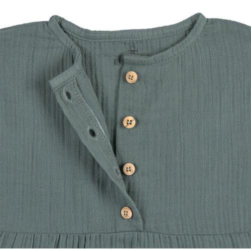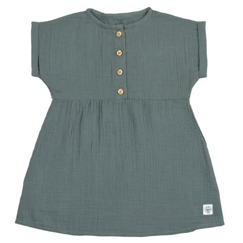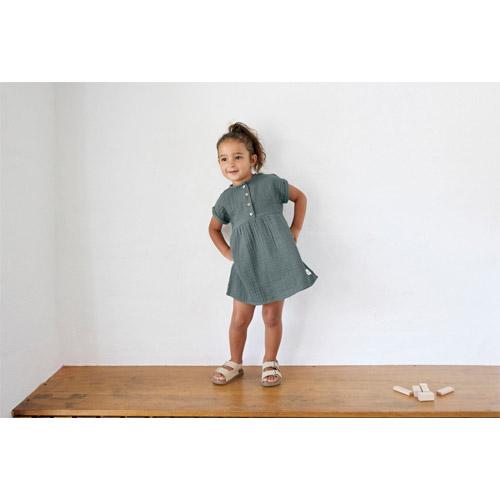 De groene mousseline jurk uit de LÄSSIG collectie voelt heerlijk zacht aan op de huid.