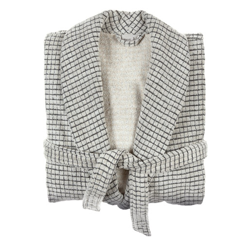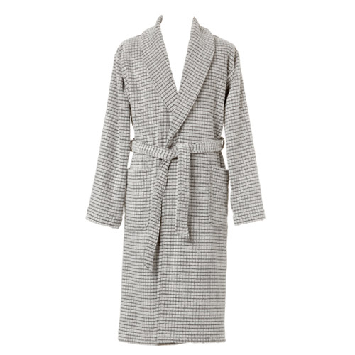 Dit model is een zwarte badjas met sjaalkraag en met een blokjesstructuur.