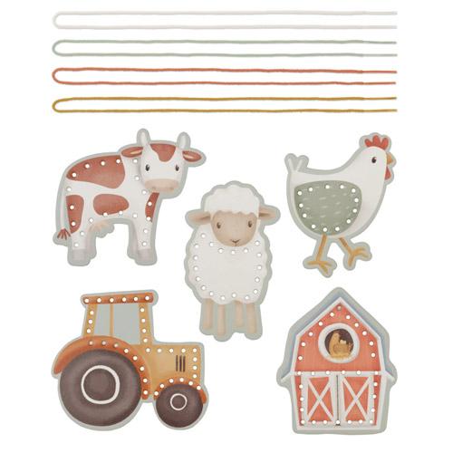 Deze set rijgkaarten wordt geleverd met twee veters en 5 kartonnen kaarten voorzien van de prachtige illustraties van de Little Farm collectie.