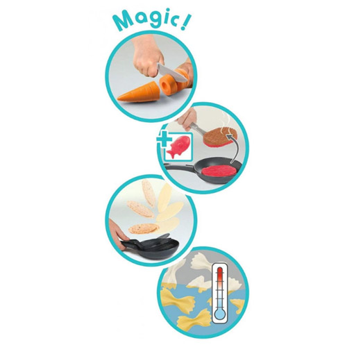 De stevige speelkeuken beschikt over een oven met afneembaar rooster, een koelkast met een mechanische ijsblokmachine, een kooktoestel met bubbelwaterfunctie waarbij het water met een druk op de knop borrelt, een spoelbak met waterkraan met popfunctie en een afzuigkap met geïntegreerde espressomachine en diverse tabbladen.