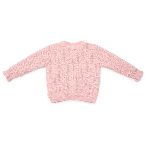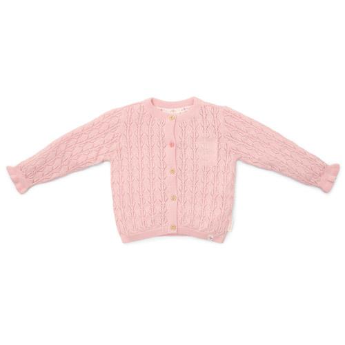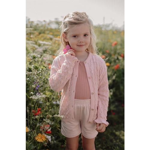 Dit fijne gebreide vestje met open structuur heeft een charmante roze tint en is gemaakt van zacht biologisch katoen, perfect om als extra laagte te dragen als het zonnetje even weg is en het wat koeler is.