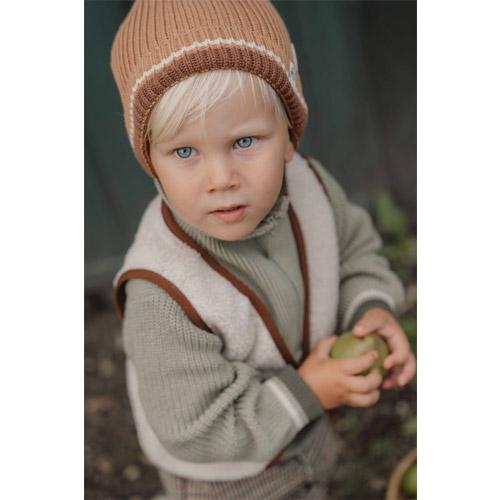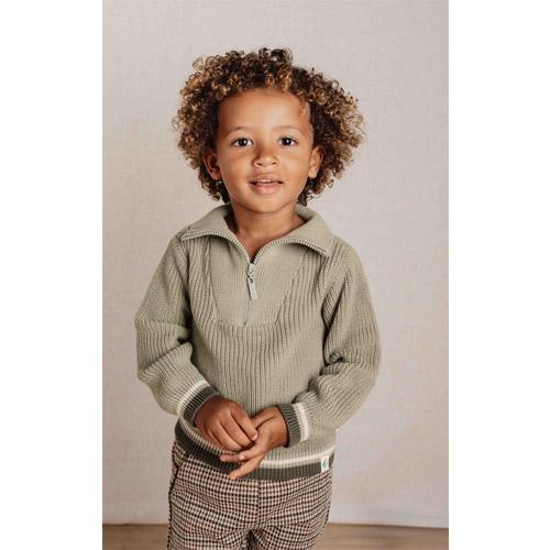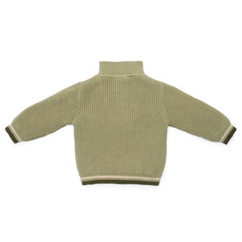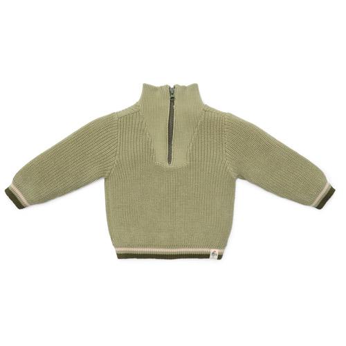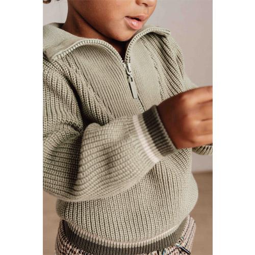 Deze gebreide trui in een natuurlijke groene tint is gemaakt van biologisch katoen en heeft een stoere ritssluiting met kraag.