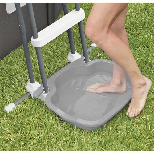 Door het plaatsen van een voetbad onderaan uw zwembad ladder houd u vuil tegen die kan meegenomen worden in het zwembad.