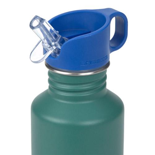 De robuuste LÄSSIG roestvrijstalen fles in groen met praktische sportdop uit de Little Gang collectie.