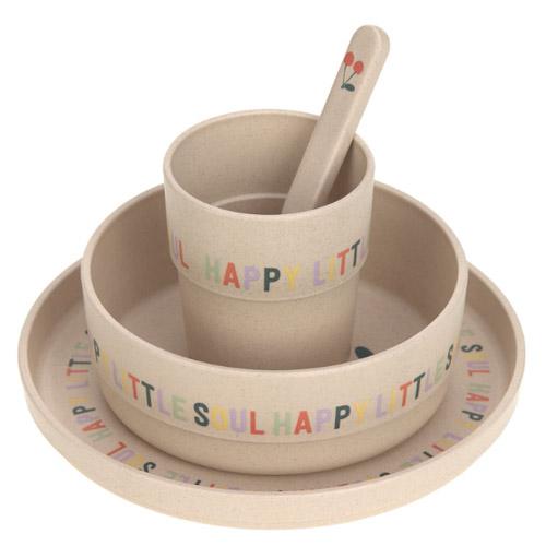 Het praktische 4-delige LÄSSIG servies uit de Happy Fruits collectie met zijn functionele details en leuke prints maakt de eerste zelfstandige eetpogingen een fluitje van een cent.
