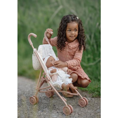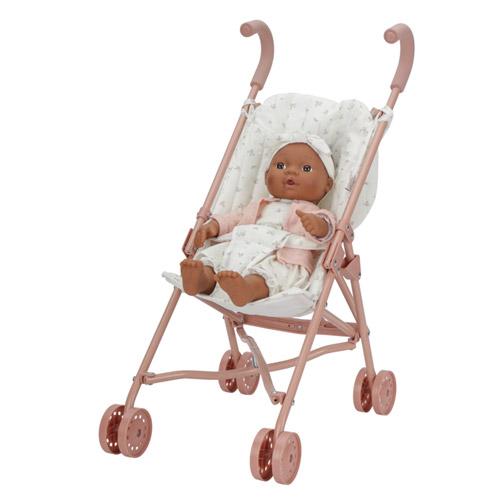 De zitting is versierd met het betoverende White Meadows dessin, en de bijpassende tas aan de handvatten biedt opbergruimte voor alle belangrijke poppenspullen.