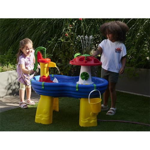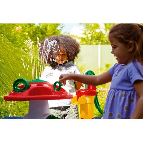 De Aquaplay watertafel is compatibel met Gardena-aansluiting voor het vullen en heeft een plug voor eenvoudig legen.